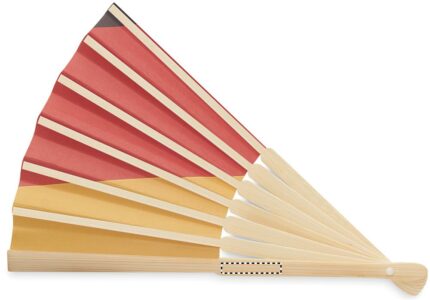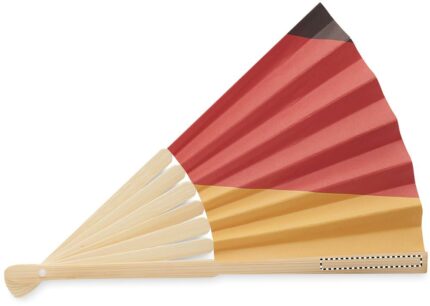 Manual hand fan in bamboo with flag design on paper fabric.