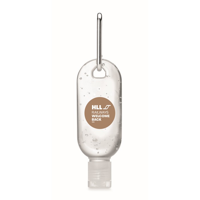 Hand cleanser gel in PET refillable bottle with flip cap and carabiner. Non-alcohol formulation. Capacity 30 ml.