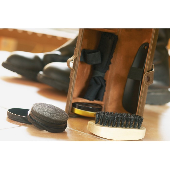 5 pieces luxurious shoe polish kit in gift box. This set includes a black shoe cloth, a black shoe horn, a wooden shoe brush, a shoe shine spongy and polish in a neutral colour.