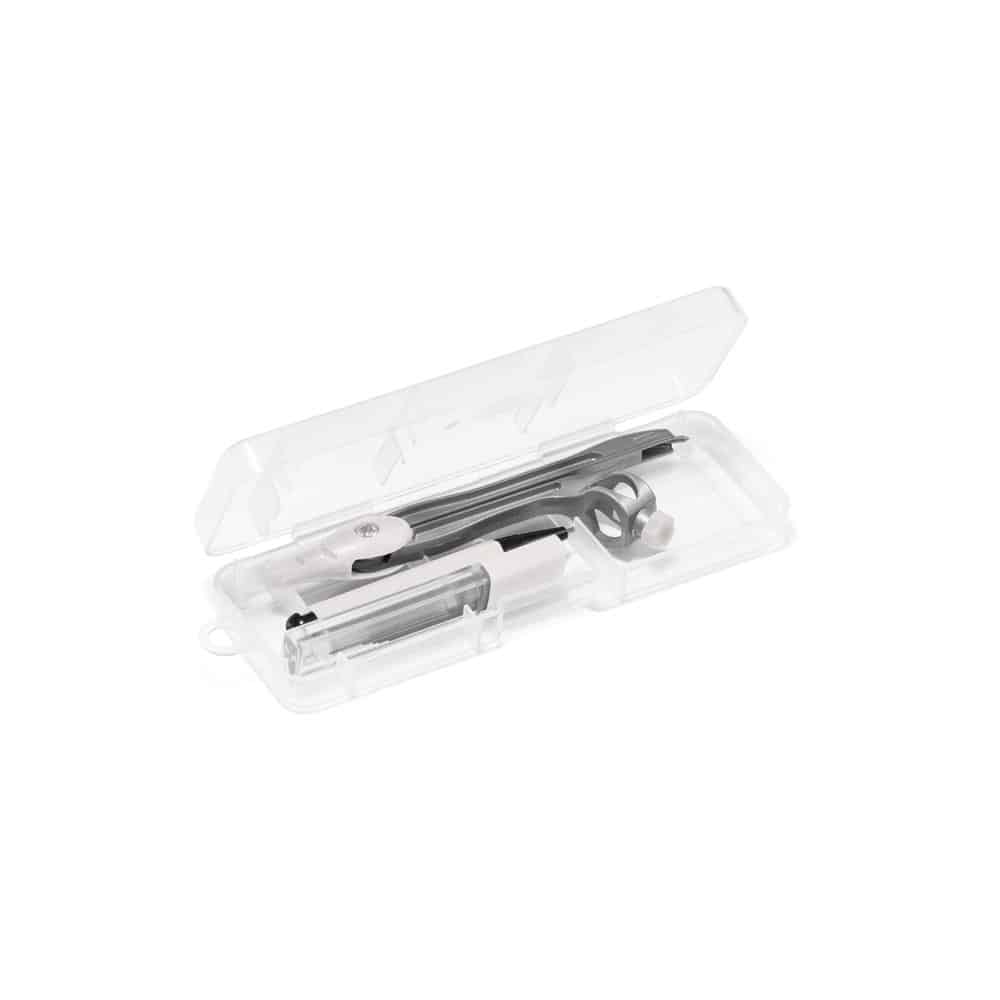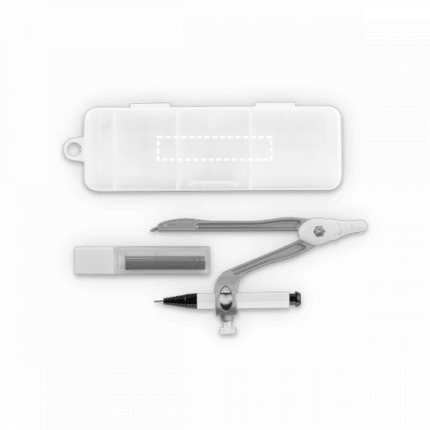 Geometry school set in a PP case. Includes 1 compass, 1 mechanical pencil and 10 0’5 mm leds. 128 x 42 x 20 mm