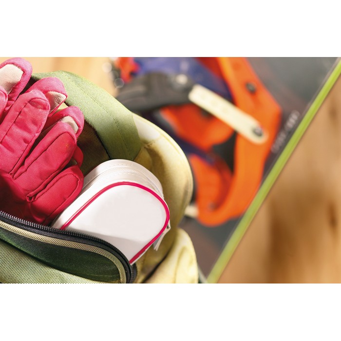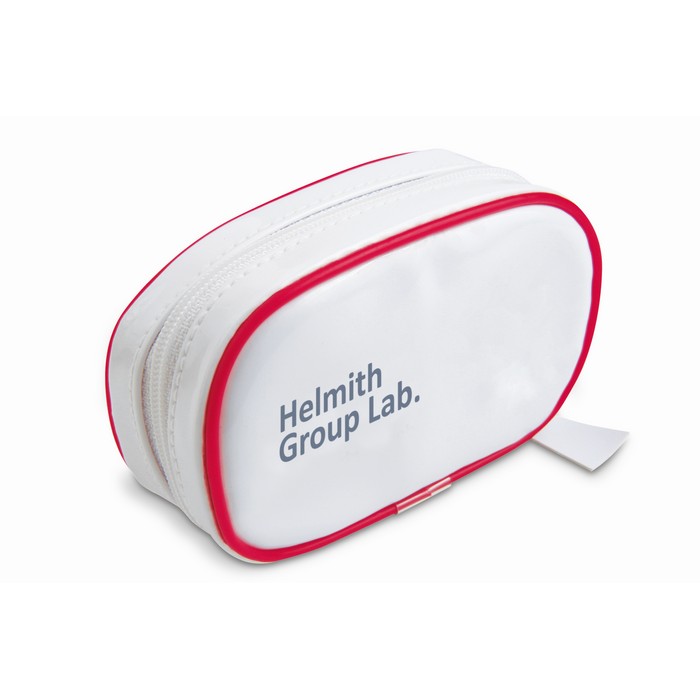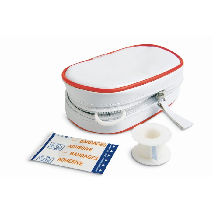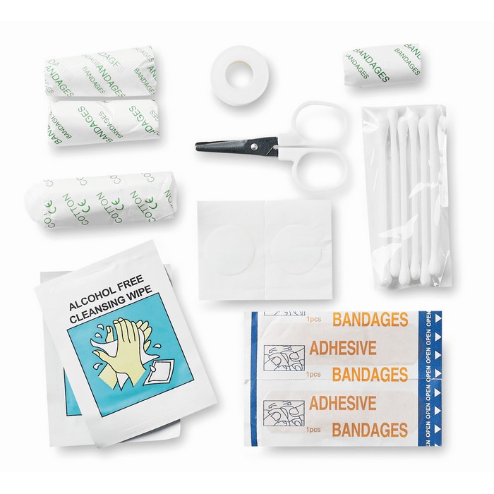 First aid kit. Includes 1 pair of scissors, 3 pad bandages, 1 roll of cotton, 2 cleaning tissues, 5 adhesive bandages, 1 roll of tape and 6 cotton buds.