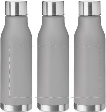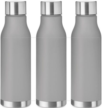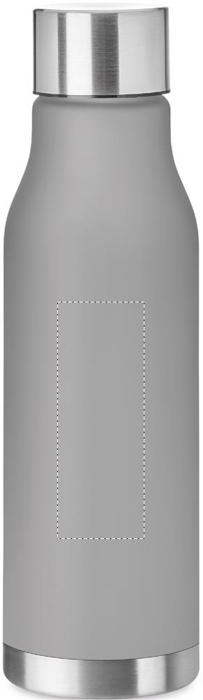 Drinking bottle in RPET with rubberised finish (frosted transparent) and stainless steel cap with inner RPET lid and silicone ring. BPA free. Leak-free. Capacity: 600 ml. Not suitable for carbonated drinks.