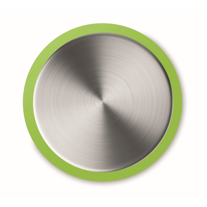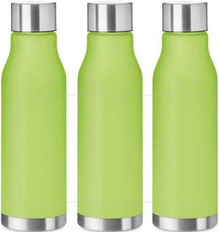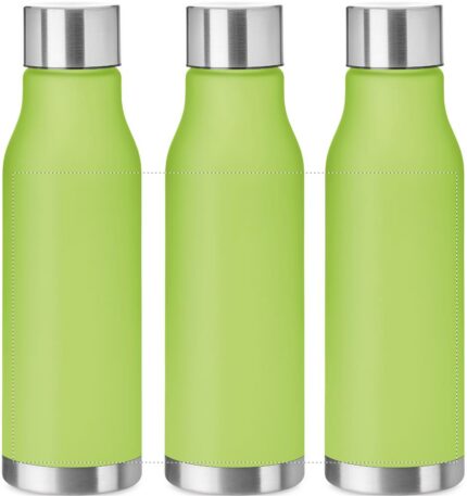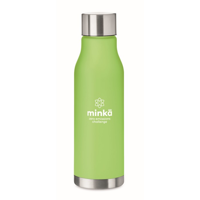 Drinking bottle in RPET with rubberised finish (frosted transparent) and stainless steel cap with inner RPET lid and silicone ring. BPA free. Leak-free. Capacity: 600 ml. Not suitable for carbonated drinks.