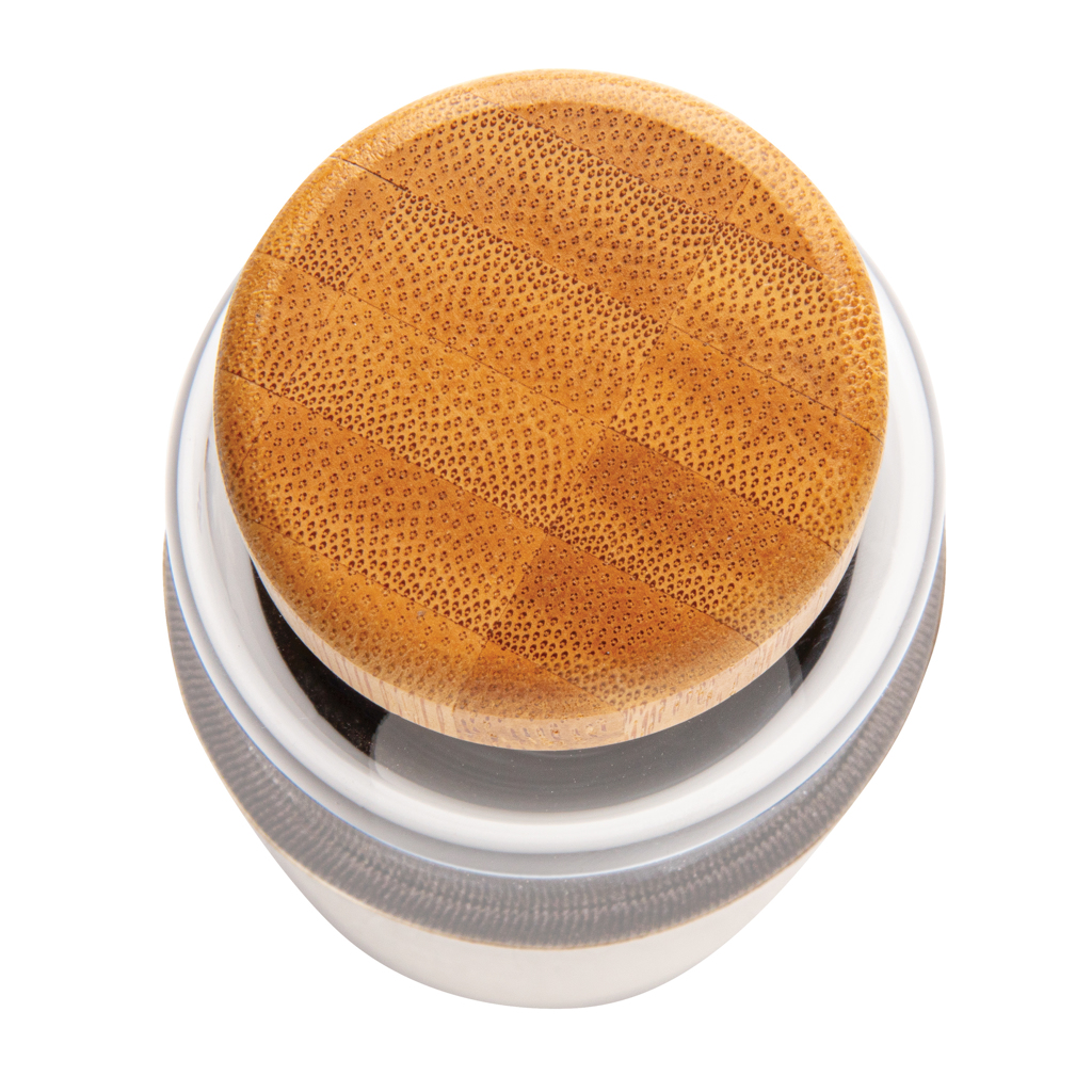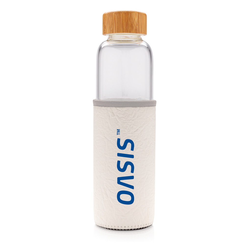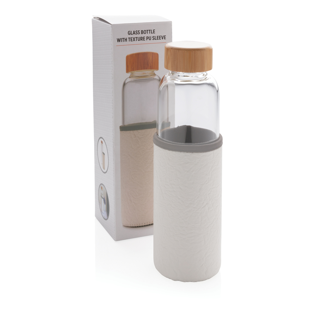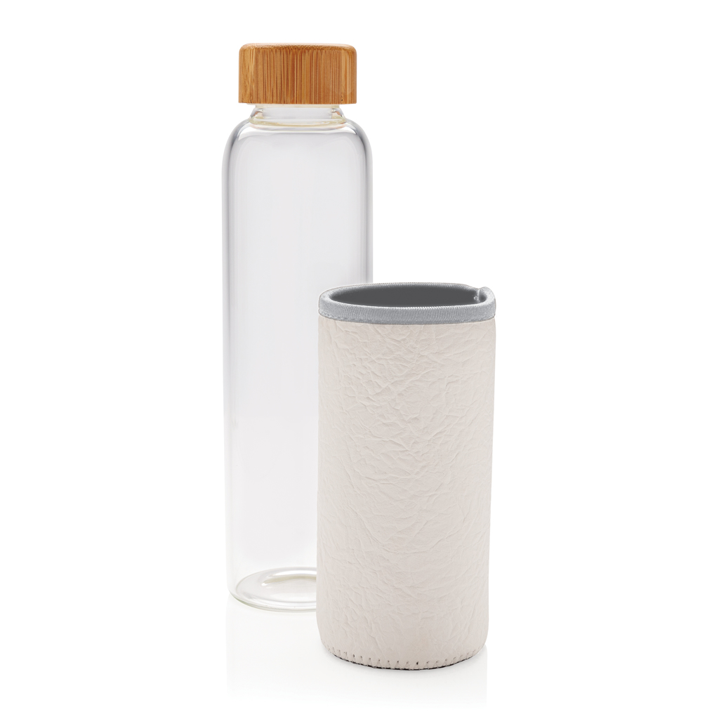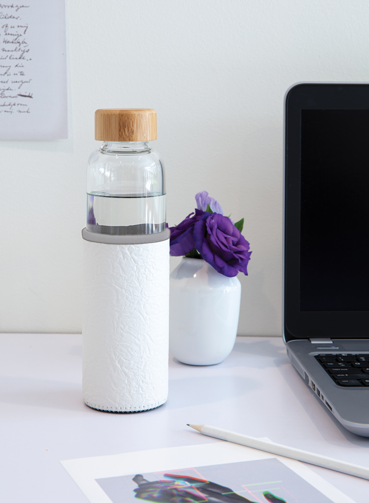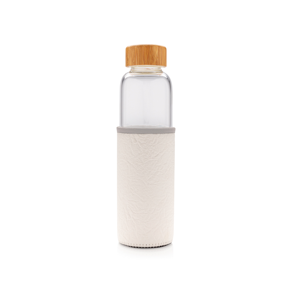 This glass bottle with textured PU sleeve is an ideal solution for those who prefer a plastic-free drinking experience. It’s made of glass and features a leak-proof bamboo lid. A wide-mouth design that allows for easy liquid intake, and a nonslip PU sleeve to protect the glass bottle while adding a fashionable touch. Capacity 550ml.