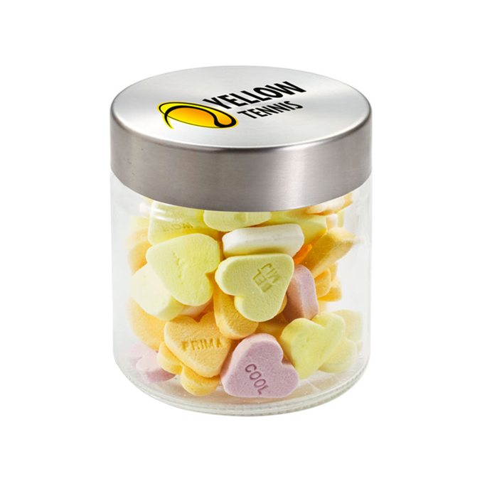 Το Γυάλινο Βάζο με καπάκι από ανοξείδωτο ατσάλι 0,35L η 0,90L περιέχει γέμιση της επιλογής σας. Το καπάκι εκτυπώνεται σε έως και 4 χρώματα.