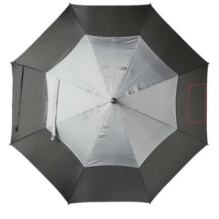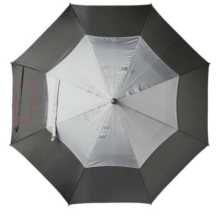Automatic opening umbrella. Vented pongee canopy. Metal shaft with fiberglass ribs. Including matching pongee storage pouch.