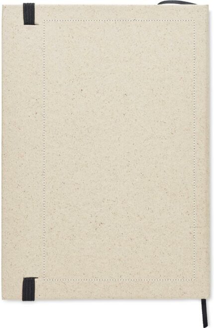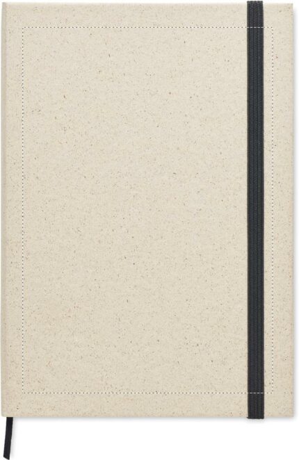 A5 grass paper notebook. Hard grass paper cover. Casebound. 160 grass paper lined pages (80 sheets). 95 gsm paper. Elastic closure strap and ribbon bookmark. Grass paper containing 40% grass fibers.