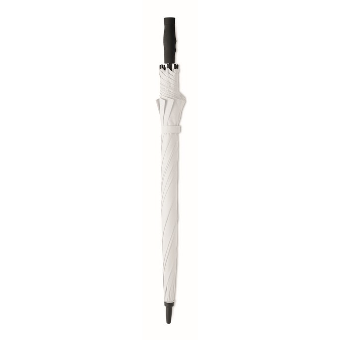 27 inch auto open windproof umbrella in 190T pongee with fiberglass shaft and ribs. Black plastic tips and top. Straight black ABS handle with rubberish finish. Manual closure.