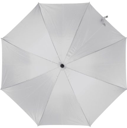 30 inch manual open windproof umbrella in 190T polyester with fiberglass shaft and ribs. Black plastic tips and top. Straight black EVA handle. Manual closure.