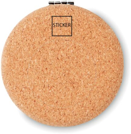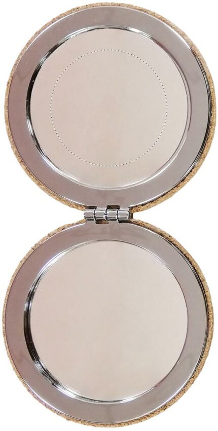 Rounded double sided compact mirror with cork finish cover. Cork is a natural material, due to its structural nature and surface porosity the final print result per item may have deviations.