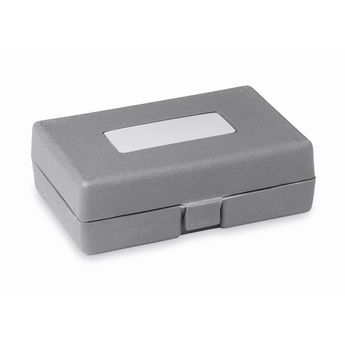 Foldable 25 pieces tool set including tweezers, 6 pc screwdriver set, extender, 4 pc socket set, flat-nose pliers, cutting pliers, and a 10pc bit set packed in a plastic box.