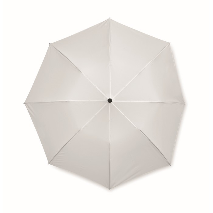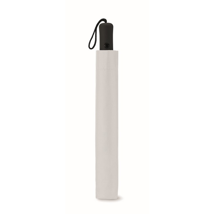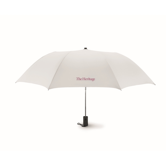 21 inch 2 fold auto open umbrella in 190T pongee with zinc plated steel shaft, ribs and tips. Black rubberised ABS handle. Includes matching pouch. Manual closure.
