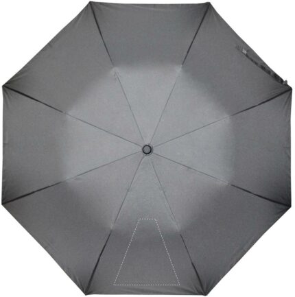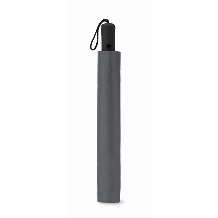 21 inch 2 fold auto open umbrella in 190T pongee with zinc plated steel shaft, ribs and tips. Black rubberised ABS handle. Includes matching pouch. Manual closure.