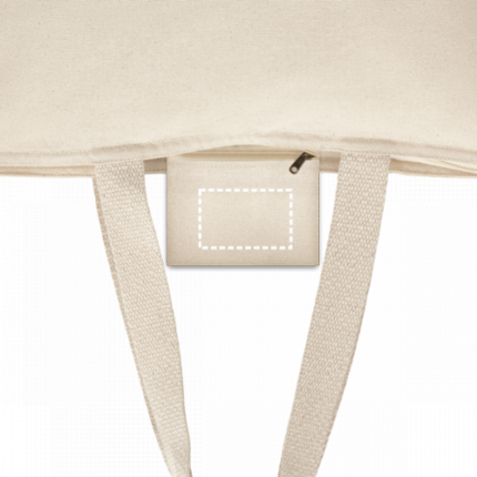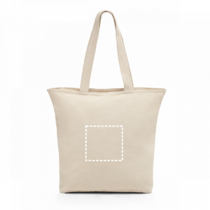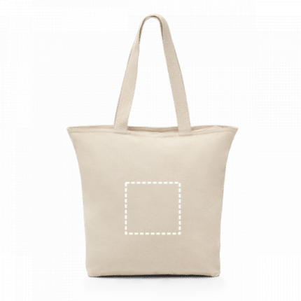 100% cotton bag (280 g/m²) with zipper and inner pocket. Cotton webbing handles with 65 cm. Bag: 480 x 400 x 150 mm | Interior Pocket: 180 x 140 mm