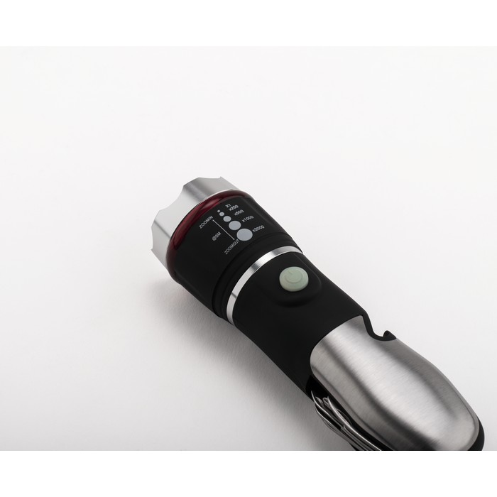 Multi-tool with torch, safety hammer and cutter. Includes 9 tool functions. ABS with rubberised finish. 3 light settings with zoom function. 3 AAA batteries not included.