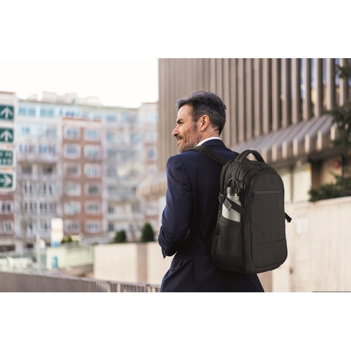 15 inch laptop backpack in 600D RPET polyester. 3 large zippered external compartments fully padded with several inside pockets. It has two mesh side pockets. Adjustable shoulder straps. Padded mesh airflow and trolley holder on reverse side.