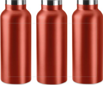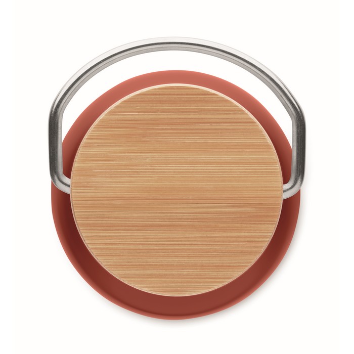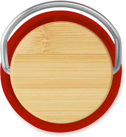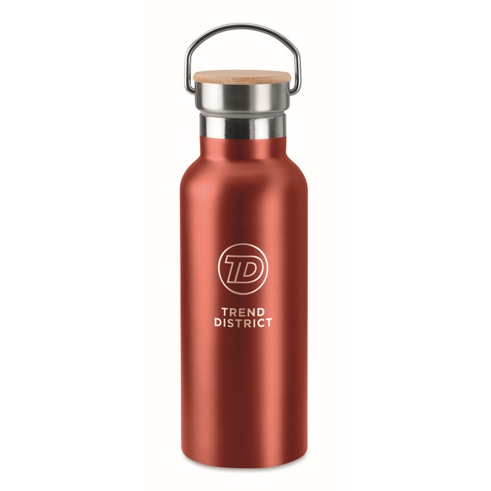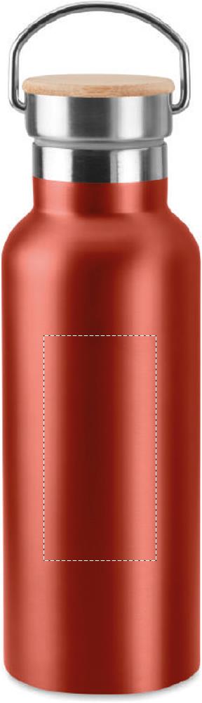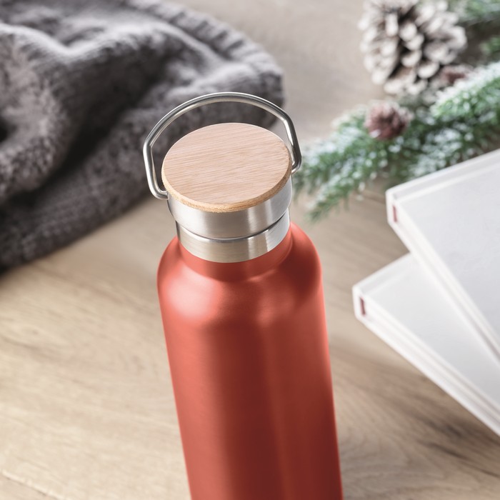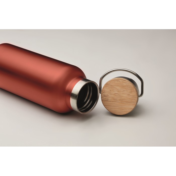 Double wall stainless steel insulating vacuum flask with lid in bamboo and carry handle. Capacity: 500 ml. Sublimation print available on white item only. Leak free.