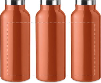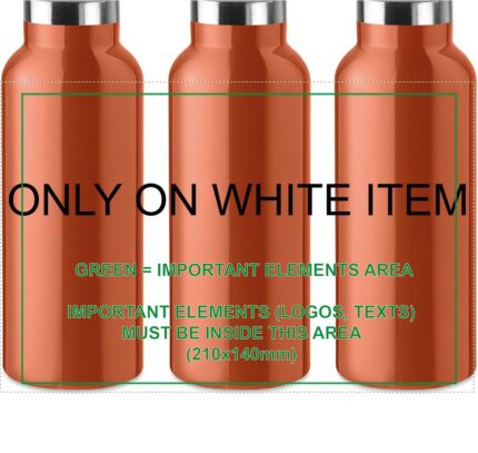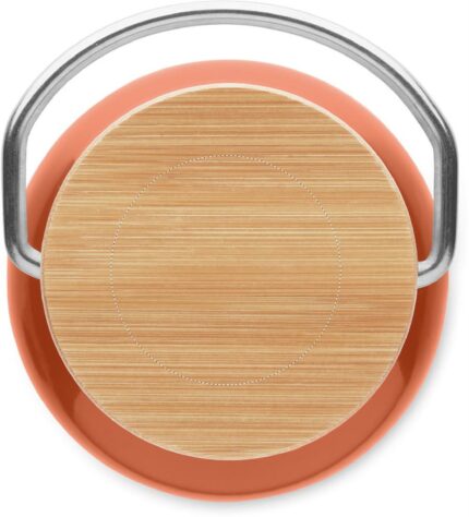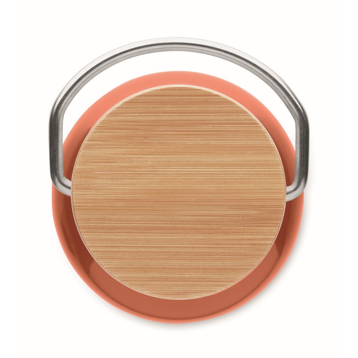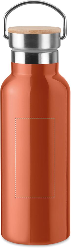 Double wall stainless steel insulating vacuum flask with lid in bamboo and carry handle. Capacity: 500 ml. Sublimation print available on white item only. Leak free.
