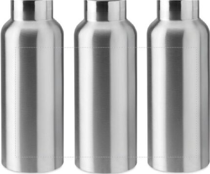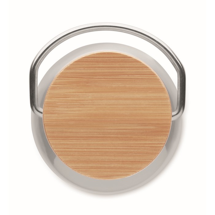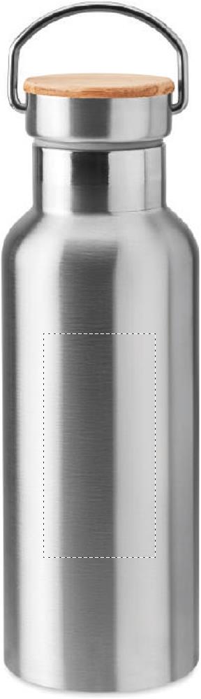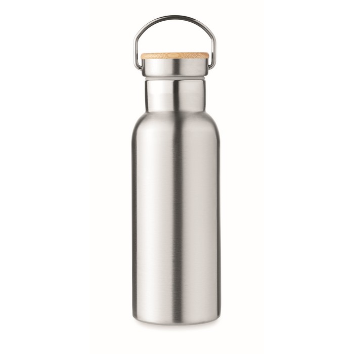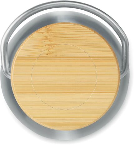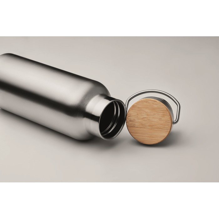 Double wall stainless steel insulating vacuum flask with lid in bamboo and carry handle. Capacity: 500 ml. Sublimation print available on white item only. Leak free.