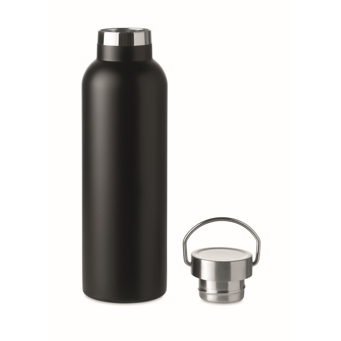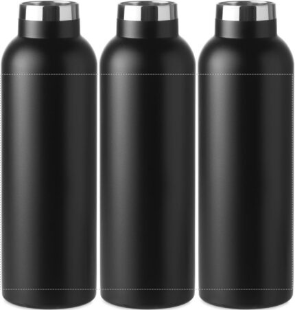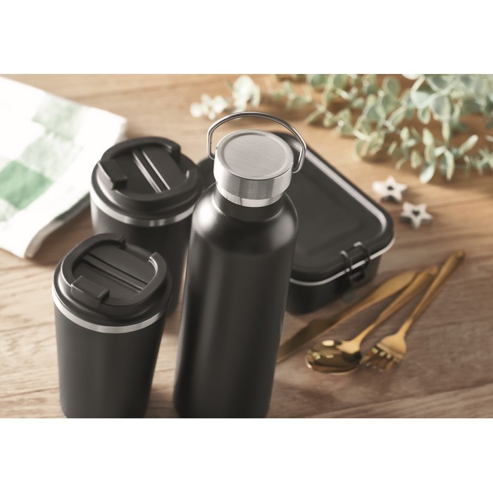 Set of stainless steel double walled bottle (capacity 750 ml) with handle, leak free and 2 stainless steel tumblers (350 ml).