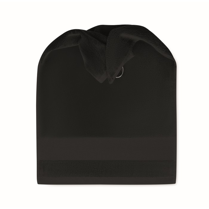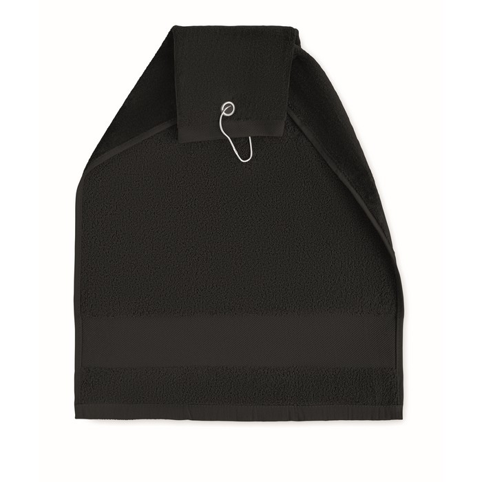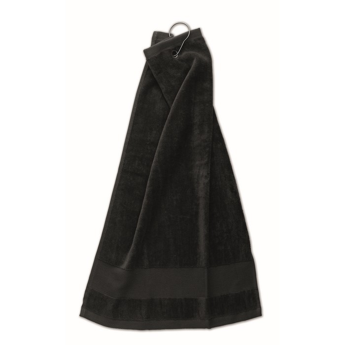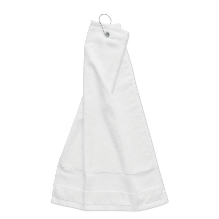Cotton golf towel with a copper hole and ring on top that can be used as a hanger. 350 gr/m². Towel size: 40×60 cm.