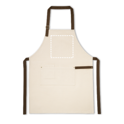 100% cotton canvas apron (320 g/m²) with metal details. With 3 multifunctional pockets and a side strip (to hang a kitchen towel). Easily adjustable neck strap. Supplied with a gift box in kraft made from FSC™ certified material and other controlled materials. 680 x 900 mm