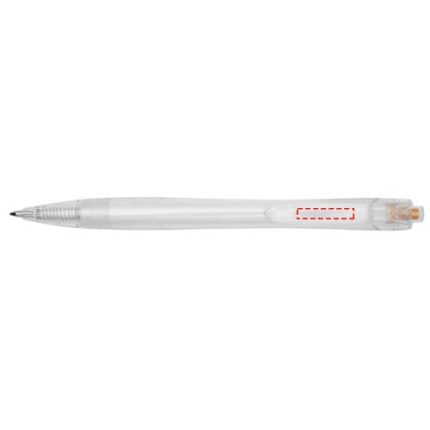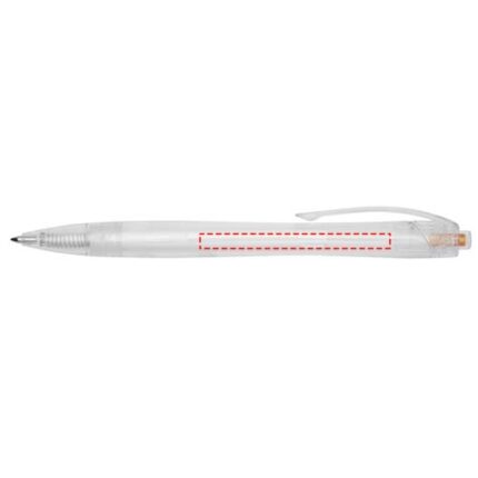 Click action ballpoint pen made from recycled PET, reducing the use of virgin plastic. The ballpoint pen comes with a transparent barrel and coloured push button. It is preloaded with a blue refill and can be combined with the 107763 Honua RPET notebook.