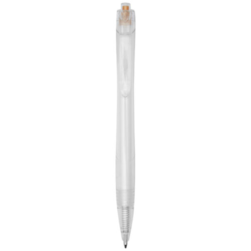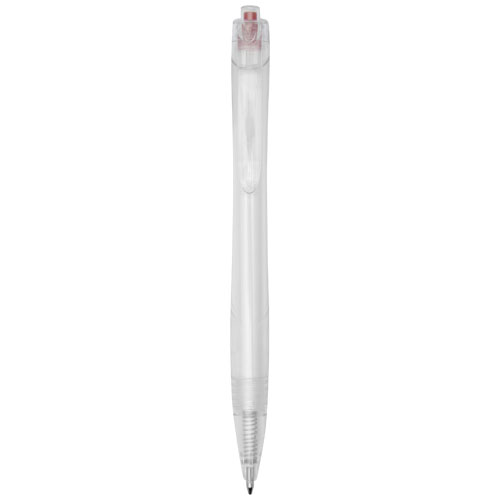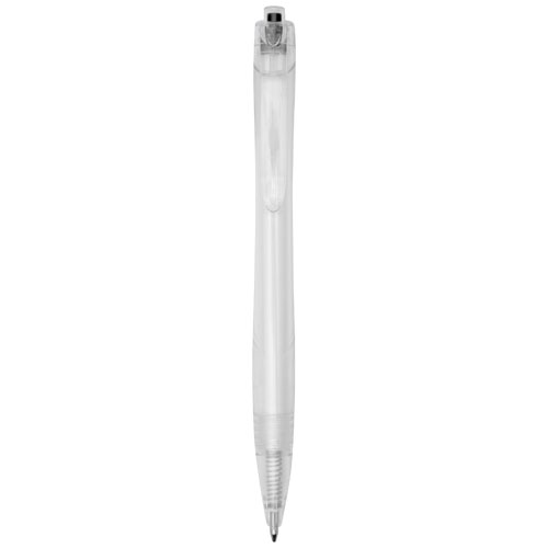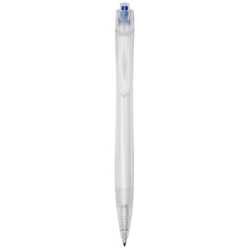 Click action ballpoint pen made from recycled PET, reducing the use of virgin plastic. The ballpoint pen comes with a transparent barrel and coloured push button. It is preloaded with a blue refill and can be combined with the 107763 Honua RPET notebook.