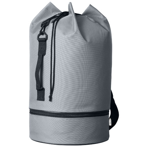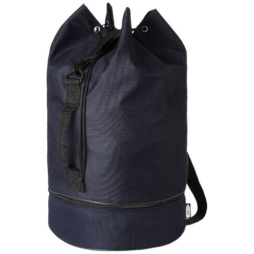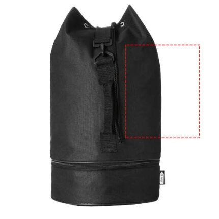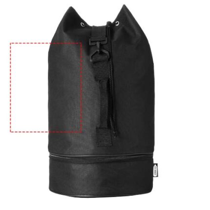 Water resistant duffel sailor bag made from recycled PET plastic with a spacious 20 litres main compartment with drawstring closure, side handle, and adjustable shoulder strap. Also features a separate zippered bottom compartment for smaller items.