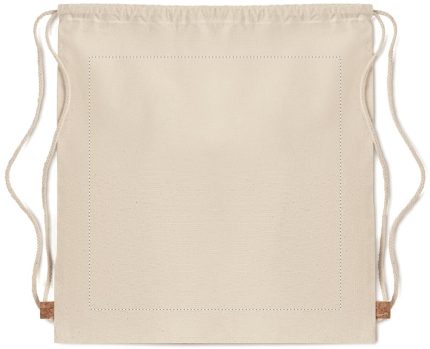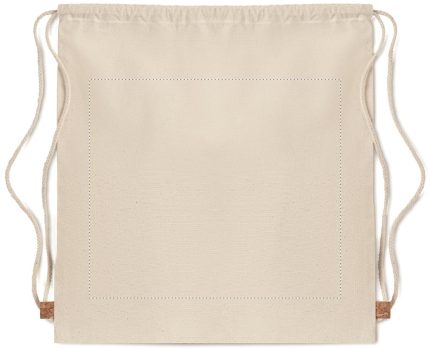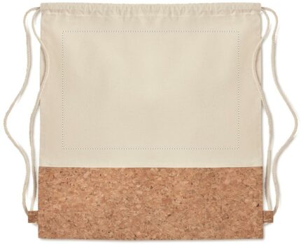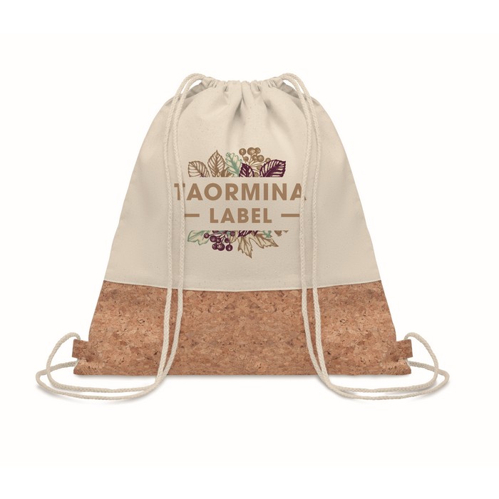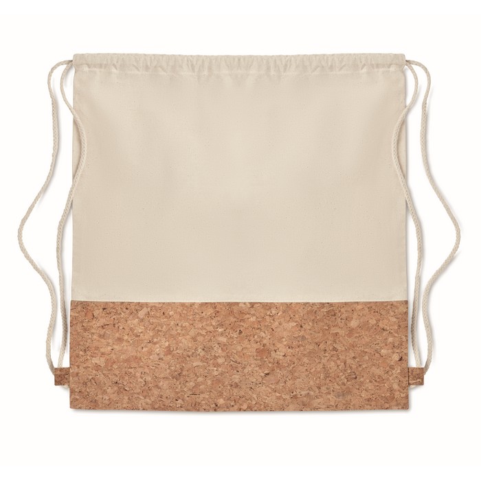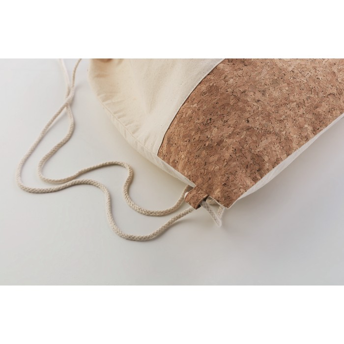 Βαμβακερή τσάντα με κορδόνι περίσφιξης με λεπτομέρεια από φελλό. 160 gr/m². Ο φελλός είναι φυσικό υλικό, λόγω της δομικής του φύσης και του πορώδους της επιφάνειας το τελικό αποτέλεσμα εκτύπωσης ανά είδος μπορεί να έχει αποκλίσεις. Παράγεται σύμφωνα με πιστοποιημένο πρότυπο για τη χρήση επιβλαβών ουσιών στην κλωστοϋφαντουργία.