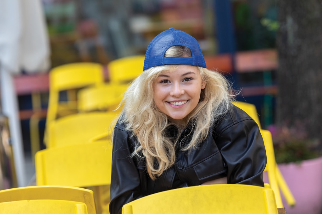 • Μία μαύρη και λευκή trucker καπαρντίνα σε άσπρο φόν Καπέλα