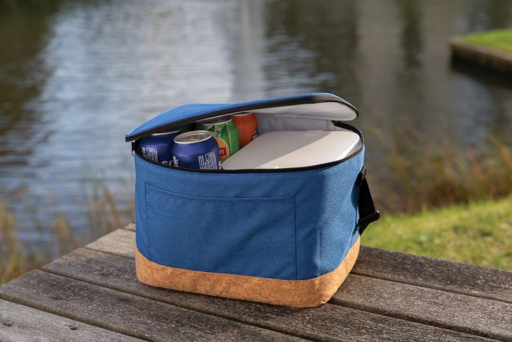 This Impact AWARE™ XL RPET two tone cooler bag with cork detail fits your favourite on-the-go meals with ease. Constructed with soft yet durable insulation and wide mouth opening, you can easily pack everything from your favourite drinks and snacks to a larger lunch. The cooler bag fits up to 12 cans. The exterior is made with two tone 50% recycled polyester, lining is PEVA and stylish cork detail around the edge. The exterior is with AWARE™ tracer that validates the genuine use of recycled materials. Each bag saves 4.2 litres of water and has reused 7.1 0.5L PET bottles. 2% of proceeds of eachImpact product sold will be donated to Water.org.