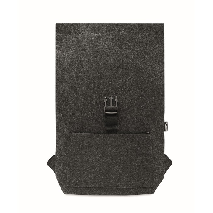 RPET felt backpack with cotton strap closure and zippered pocket on the front. It has a laptop compartment.