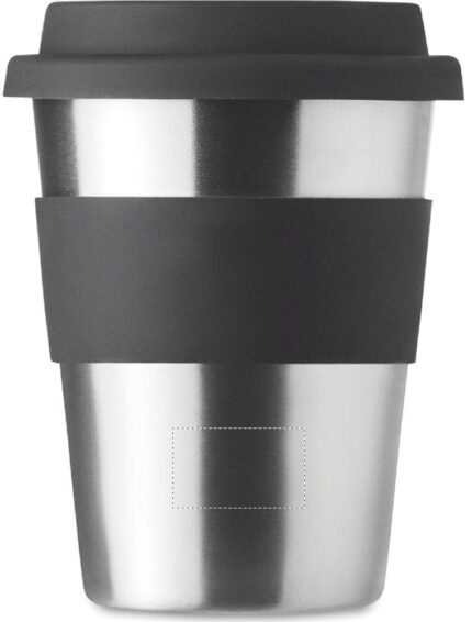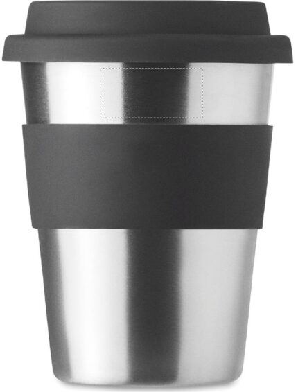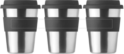 Stainless steel single wall tumbler with silicone lid and grip. Capacity 350 ml. As this is a single walled mug heat transfer can still occur.