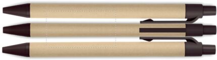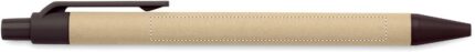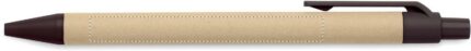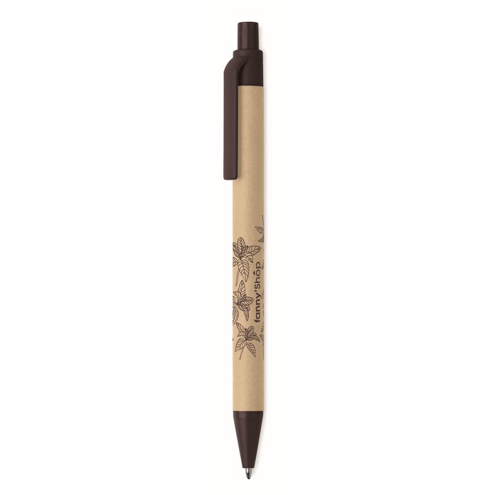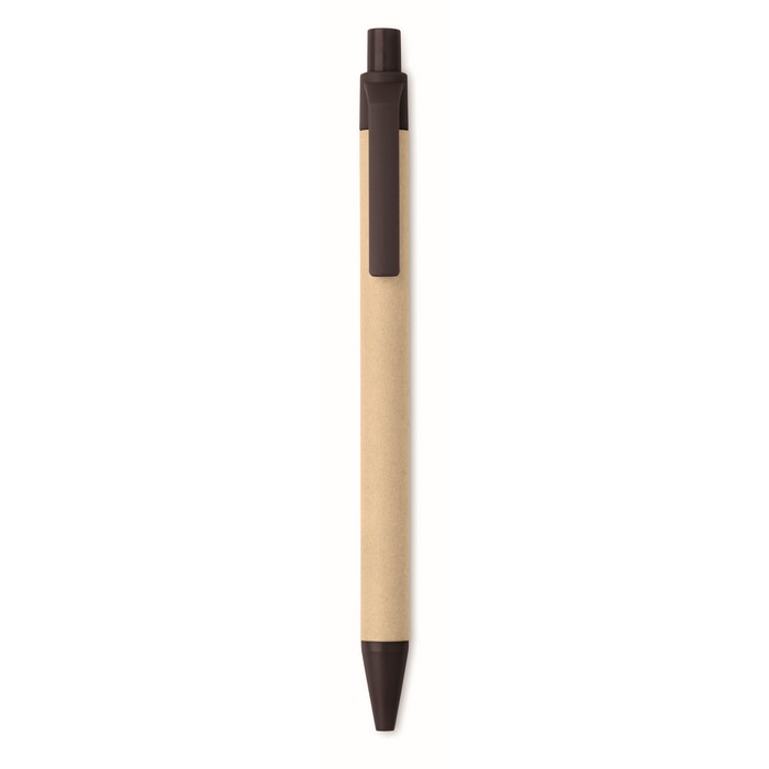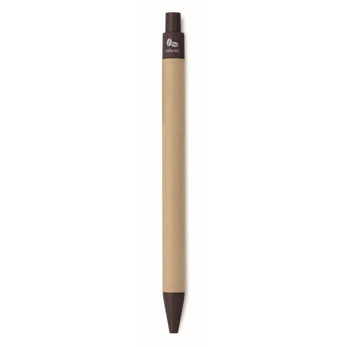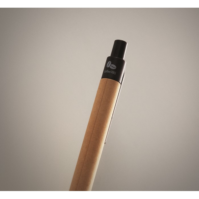 Push button paper barrel ball pen with parts made of 40% coffee husk and 60% ABS. Blue ink.