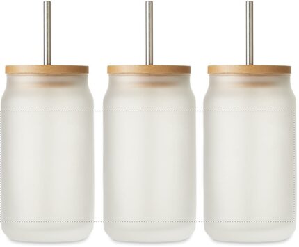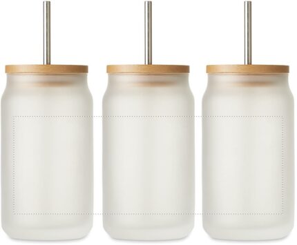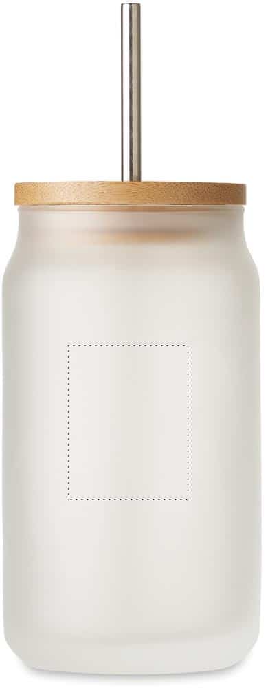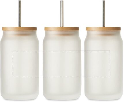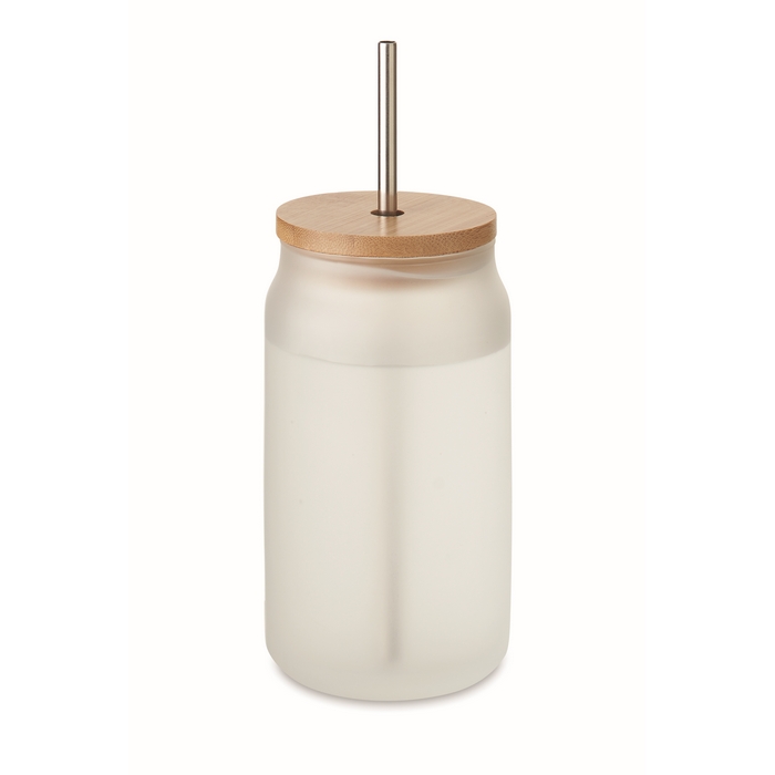 Mason cocktail jar with special coating for sublimation with bamboo lid. Including a Stainless Steel straw. Capacity:400 ml.