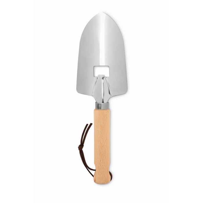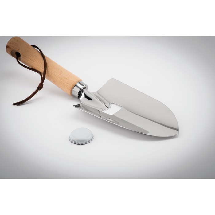 Trowel shape bottle opener in wood and stainless steel with string loop.
