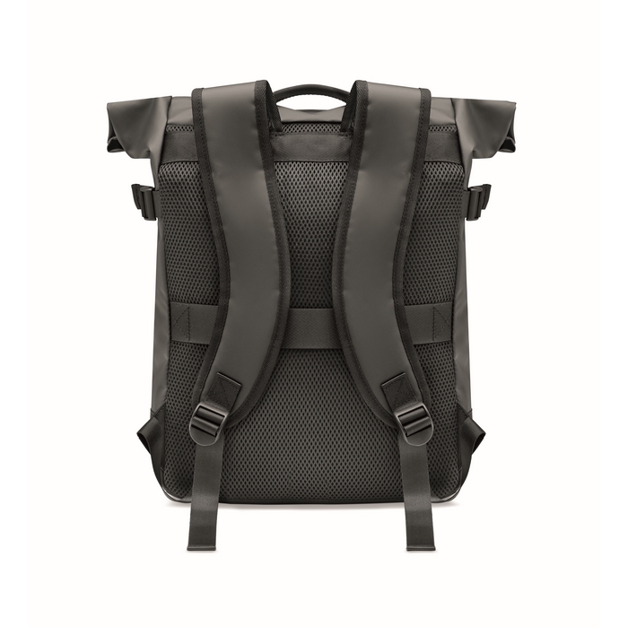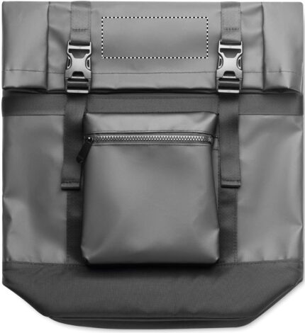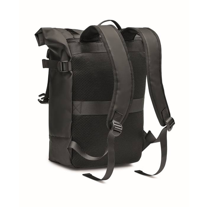 Rolltop backpack in 50C tarpaulin with padded back, base and shoulder straps reinforcement. Front zippered pockets.