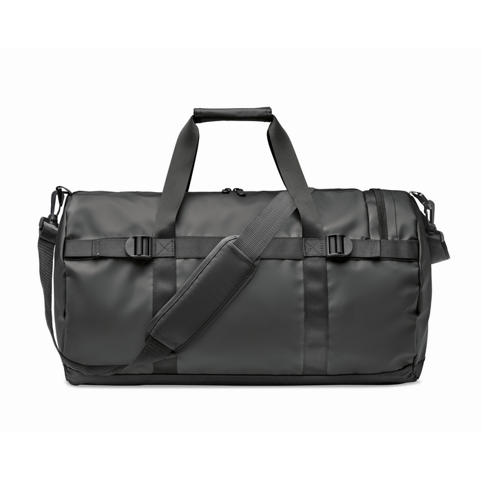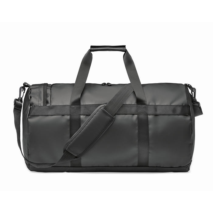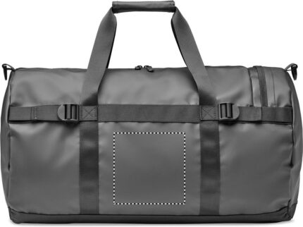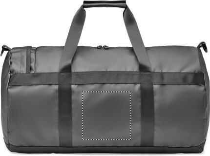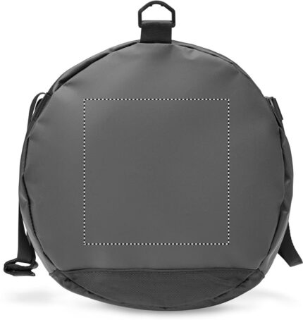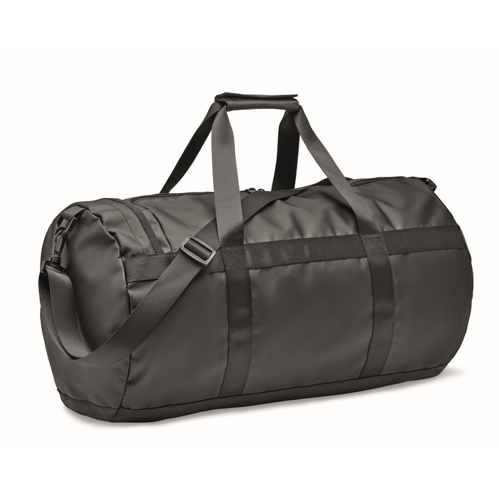 Duffle bag, sports or travel bag in 50C tarpaulin with zippered side compartment and zippered inner pocket. It has a comfort grip handle and padded base.