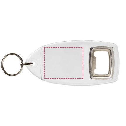 Clear R1 keychain with bottle opener and metal split keyring. The metal looped ring offers a flat profile which is ideal for mailings. Print insert dimensions: 4,0 cm x 3,2 cm.
