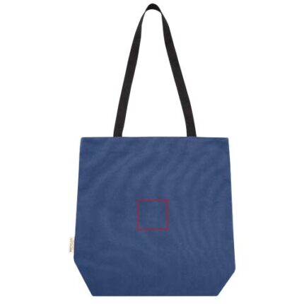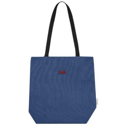 Tote bag made of GRS certified recycled canvas and GRS certified RPET lining. This versatile tote bag features a padded 15″ laptop compartment and two sleeve pockets inside for a phone, wallet or accessories, and an easy button closure to the opening and comfortable cotton webbing handles. The decorative metal plate can make a logo shine through its subtle and matt finish.