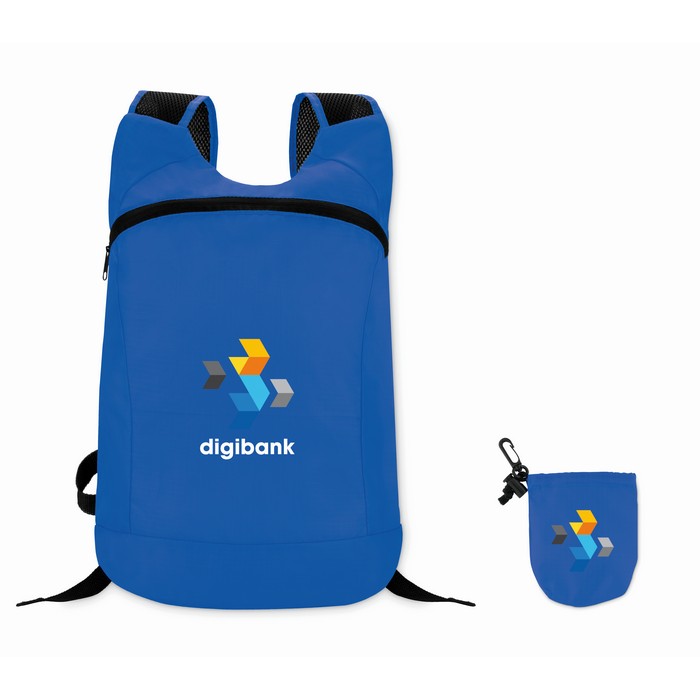 Foldable sports rucksack in ripstop polyester with zippered front opening, mesh shoulder strap and detachable pouch.