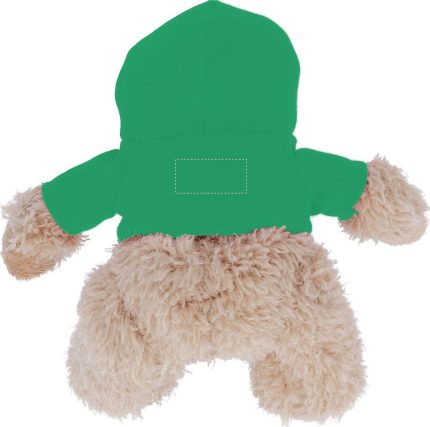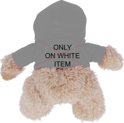 Teddy bear plush wearing a hooded sweater. Sublimation print available on white item only.
