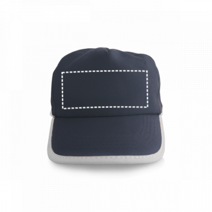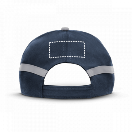 Polyester cap with reflective elements, ventilation holes and adjustable closure with self-adhesive hook and loop fastener. Promotional product. Size: 580 mm