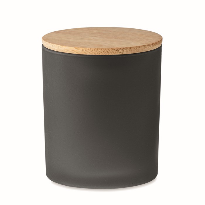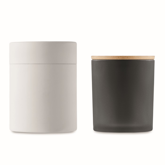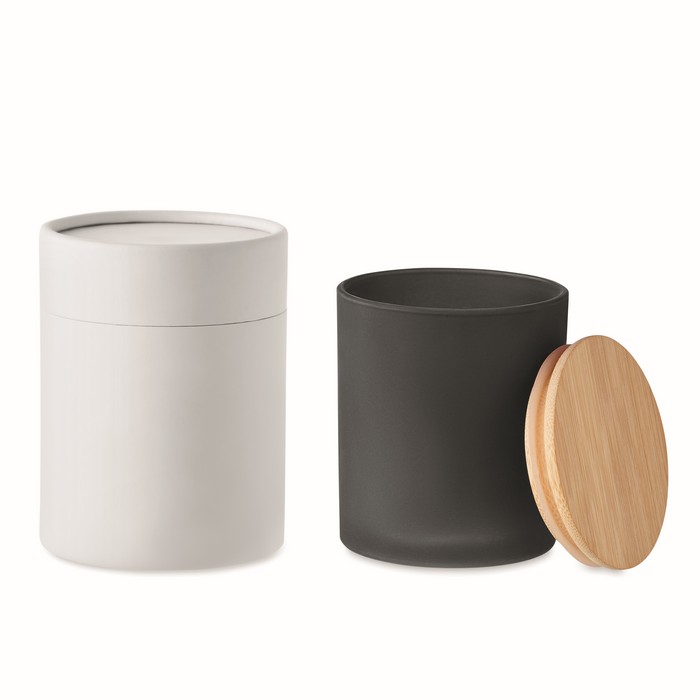 Fragranced plant based wax candle in frosted glass jar holder with bamboo lid. 280 gr. Burn time: 46 hours. Presented in a paper tube gift box.