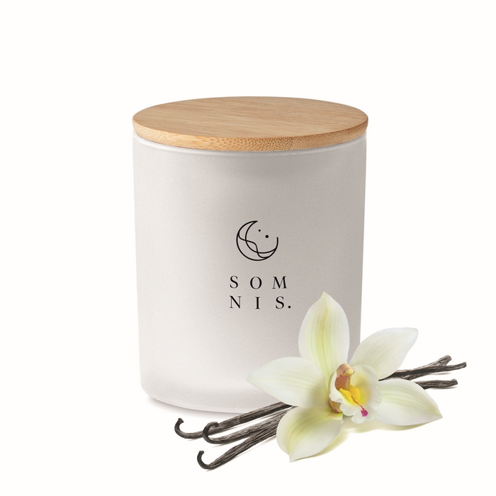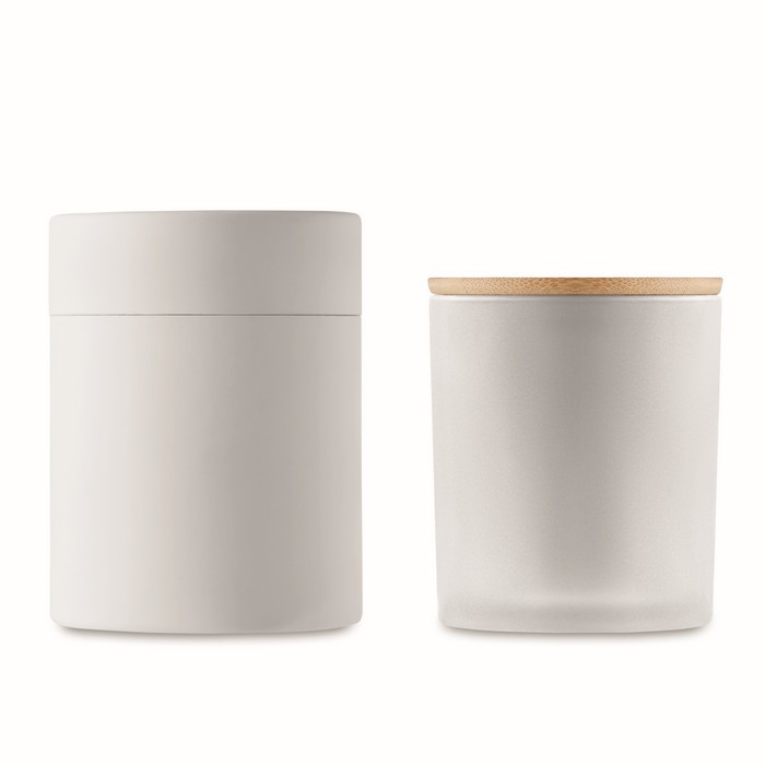 Fragranced plant based wax candle in frosted glass jar holder with bamboo lid. 280 gr. Burn time: 46 hours. Presented in a paper tube gift box.