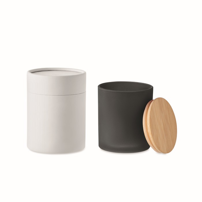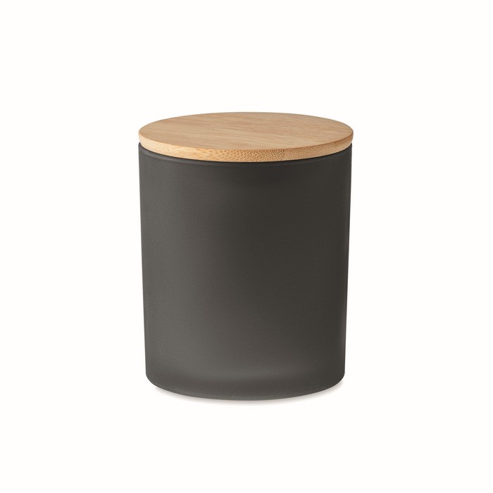 Fragranced plant based wax candle in frosted glass jar holder with bamboo lid. 120 gr. Burn time: 20 hours. Presented in a paper tube gift box.