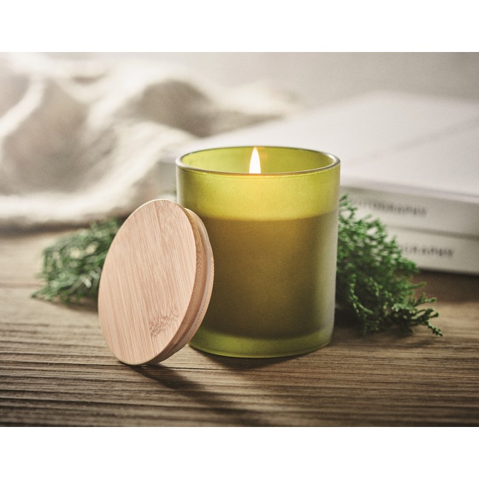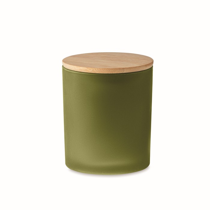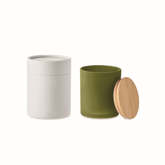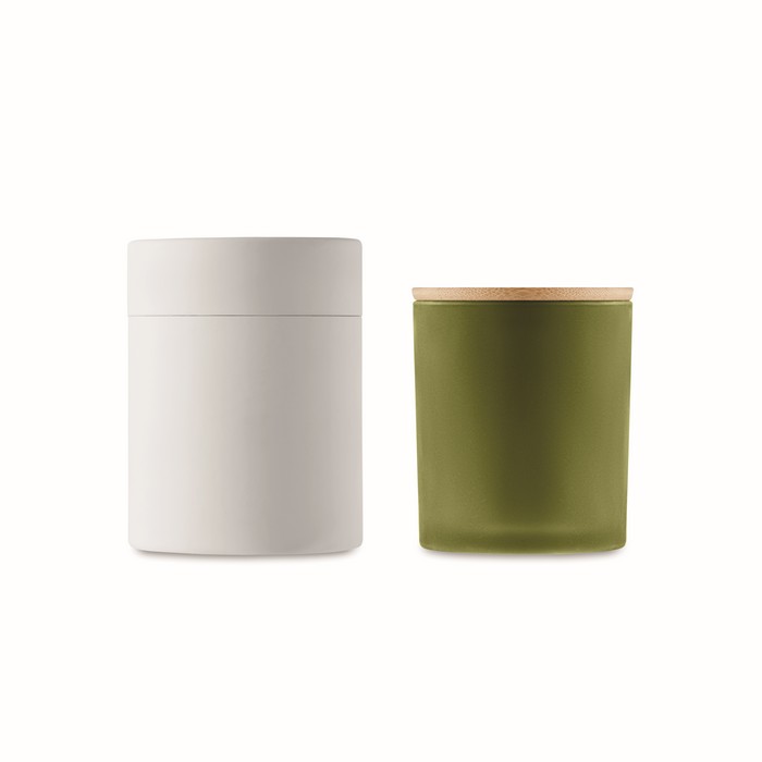 Fragranced plant based wax candle in frosted glass jar holder with bamboo lid. 120 gr. Burn time: 20 hours. Presented in a paper tube gift box.