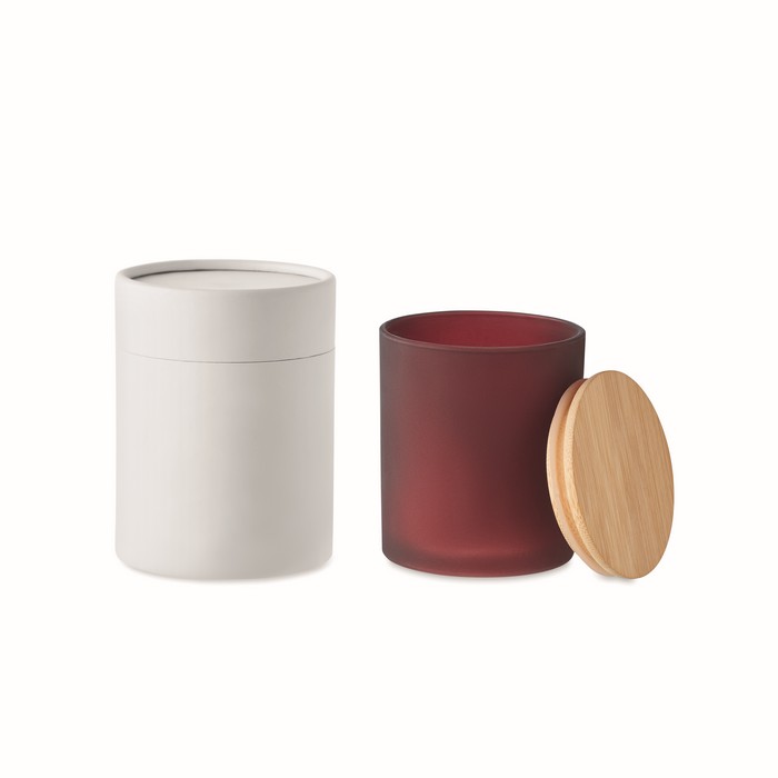 Fragranced plant based wax candle in frosted glass jar holder with bamboo lid. 120 gr. Burn time: 20 hours. Presented in a paper tube gift box.