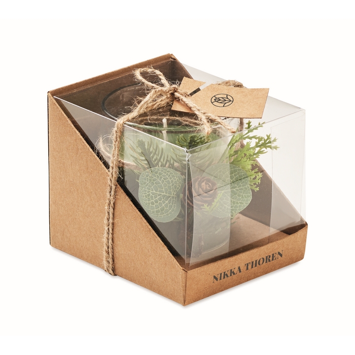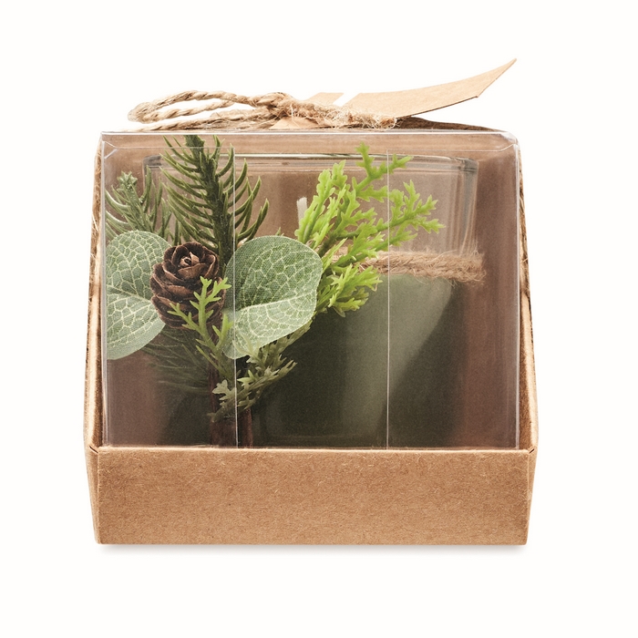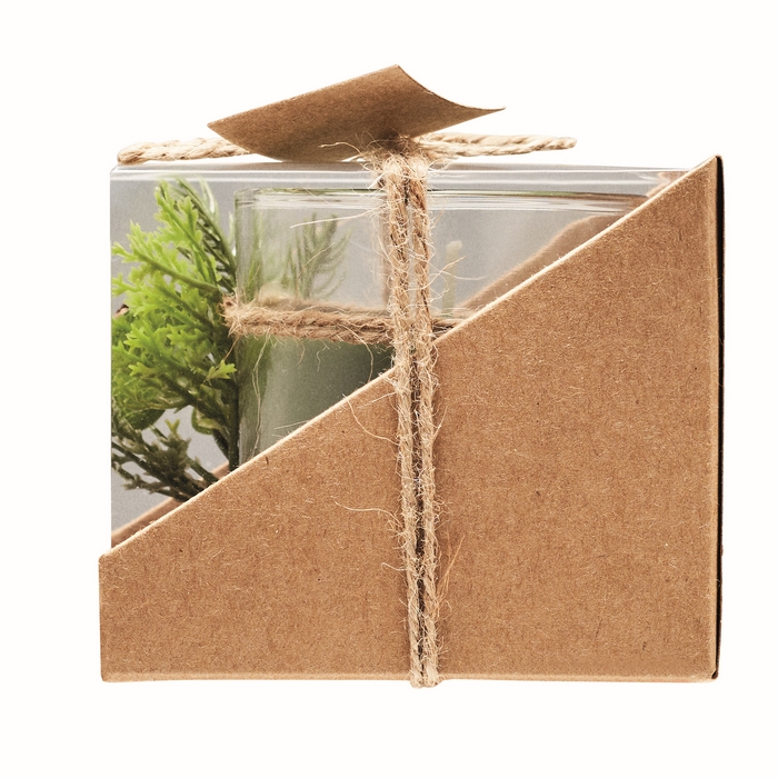 Ανακαλύψτε το FOREST, ένα γυάλινο κηροπήγιο βάρους 120 γρ. με διάταξη δάσους, παρουσιασμένο σε κουτί από χαρτόνι και PVC με κορδόνι γιούτας και ετικέτα kraft. Κερί συμπεριλαμβάνεται.